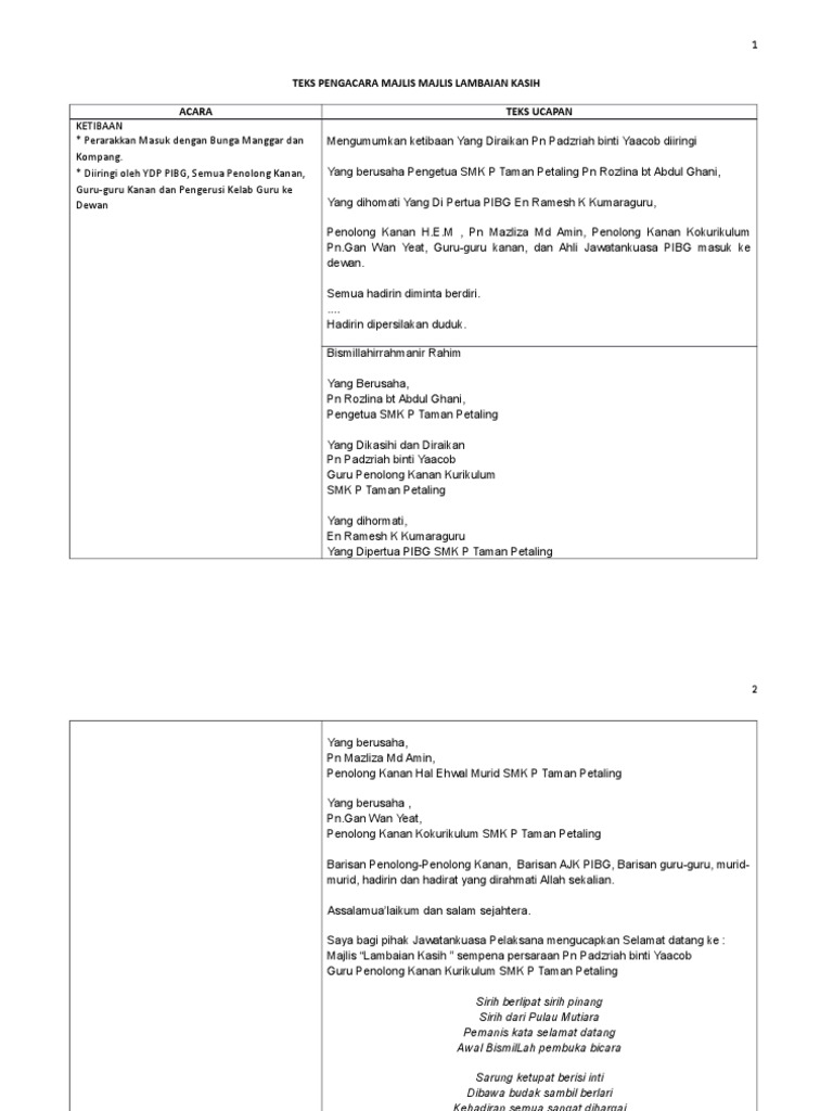 Skrip Pengacara Majlis Persaraan from imgv2-1-f.scribdassets.com Saudara dan saudari tuan tuan dan puan puan dipersilakan untuk mengambil tempat duduk kerana majlis akan bermula sebentar lagi. You are on teks ucapan majlis perpisahan. Betulkan imej anda, tambah penapis yang menarik dan sunting teks. Montaj kemerdekaan mrsm muar 2019. Disini admin nak kongsikan bahan tersebut. Teks pengacara majlis perkahwinan muhammad syakir bin roslan dan nurul najwa bt hj mohd nazri pada 18 februari 2018 di teratak ibunda ( kompang dimainkan) anak cina memasang lukah lukah dipasang di tanjung selasih. Majlis persaraan pn noorbani binti hamzah telah diadakan pada 29 september 2016. Guru boleh edit mengikut kesesuain majlis yang dibuat.