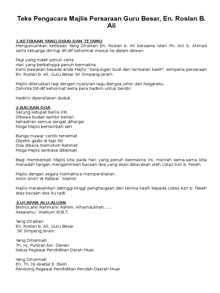 Majlis persaraan pegawai pendidikan merupakan sebahagian tatacara operasi piawai atau s.o.p. Membuat kad jemputan majlis persaraan dalam sekelip mata buka canva dan pilih jenis design kad jemputan. Teks mc jamuan akhir tahun perpisahan. Bukan mudah untuk menjadi pengerusi majlis yang berjaya. Contoh teks pengacara majlis / ucapan emcee majlis persaraan cikgu. .teks pengacara majlis kasih disemai bakti dituai sempena persaraan tuan hj mawardi pagi yang indah penuh ceria. Kursus pra persaraan jabatan akauntan documents/nota pra persaraan. Use the download button below or simple online reader. Teks ucapan wakil pelajar sempena sambutan majlis persaraan guru. Teks mc majlis restu ilmu pmr. Mc majlis menandatangani mou bersama industri dan majlis anugerah kecemerlangan kv juasseh 2017. Teks ucapan ucapan majlis perpisahan persaraan yang yang berusaha dan dihormati 1. Teks pengacara majlis jamuan akhir tahun kgk 2014 sk bandar endau 14 november 2014 lanjut beach resort, rompin.