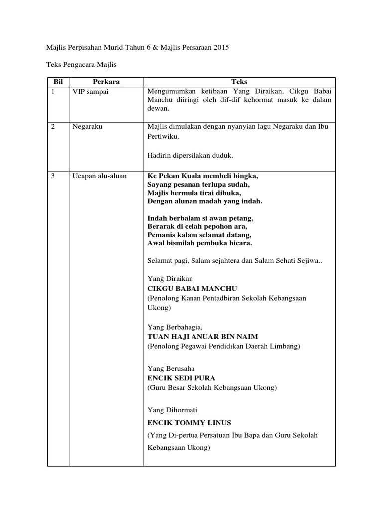 Teks Pengacara Majlis Perpisahan from imgv2-1-f.scribdassets.com Teks ucapan majlis perpisahan persaraan mp3 & mp4. Teks ucapan mc majlis penyampaian bantuan awal persekolahan skmd. Assalamu'alaikum warahmatullahi wabarakatuh salam sejahtera buat kita semua pada video kali ini saya akan berbagi tentang teks mc (pembawa acara) pengajian. Teks pengacara majlis majlis 1 teks pengacara majlis majlis jasamu di kenang sempena persaraan pn jaharahbt kandar guru penolongkanan kokurikulumsktaman suria 15 november 2013. Teks mc jamuan akhir tahun & perpisahan 1. Teks ucapan ucapan majlis perpisahan persaraan yang yang berusaha dan dihormati 1. Teks ucapan mc majlis penyampaian bantuan awal persekolahan skmd. Teks pengacara majlis majlis perpisahan jan 2018.