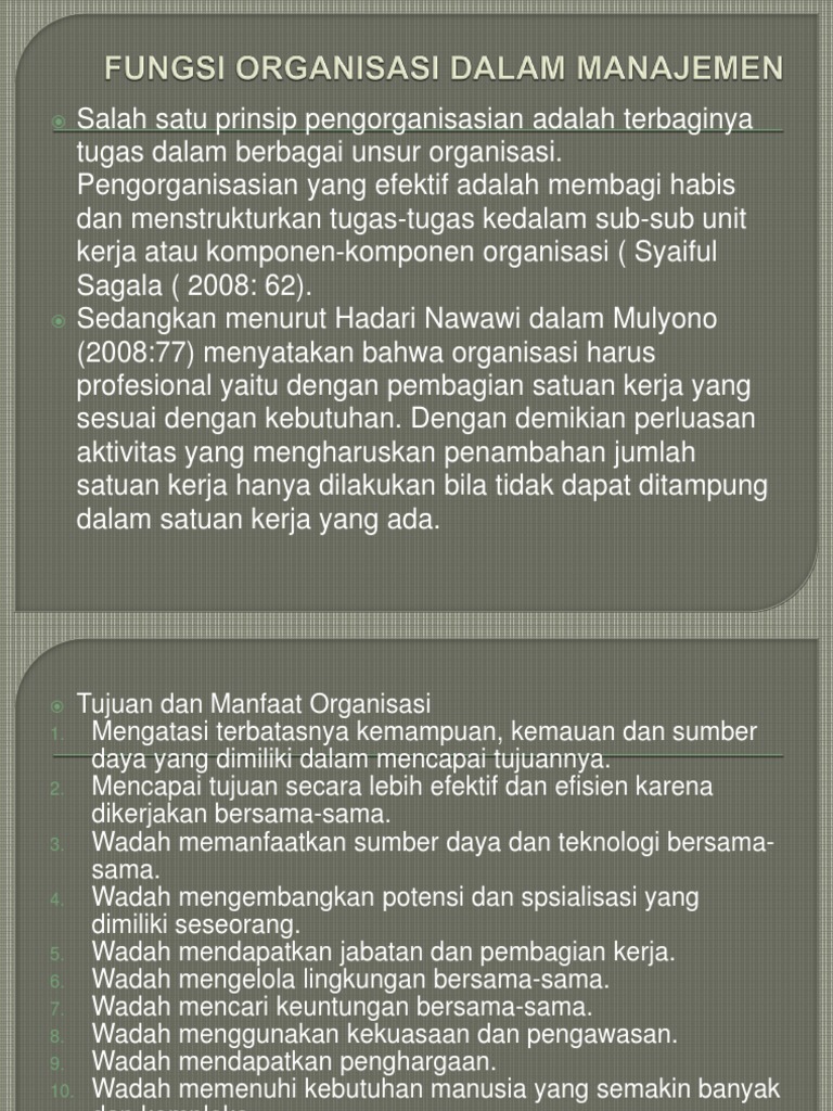 fungsi-organisasi-dalam-manajemen.ppt from imgv2-2-f.scribdassets.com Mengingat kendala dan implikasi yang akan dihadapi dalam rencana pengembangan jabatan fungsional sangat kompleks. Analisis jabatan ini adalah salah satu fungsi penting dalam manajemen sumber daya manusia untuk menempatkan orang yang tepat pada posisi yang tepat. Dalam konteks tersebut, struktur organisasi berfungsi untuk memberikan kejelasan tentang tanggung jawab tersebut. Susunan organisasi dalam perusahaan biasanya dibentuk atas kesepakatan para pemilik perusahaan. Contoh pejabat fungsional adalah jabatan fungsional auditor, peneliti, guru. Pemilik jabatan fungsional tidak tercantum dalam struktur organisasi, akan tetapi dari sudut pandang tugas dan fungsi pekerjaannya tidak bisa terlepas dari keberadaan struktur organisasi dan sangat diperlukan oleh k/l/pd. Direksi termasuk dari 4 jabatan penting yang harus ada dalam sebuah perusahaan, terdiri dari direktur utama, direktur keuangan, dan direktur personalia. Tujuannya adalah agar tidak terjadi untuk organisasi yang sederhana, kamu tidak perlu merinci terlalu banyak jabatan.