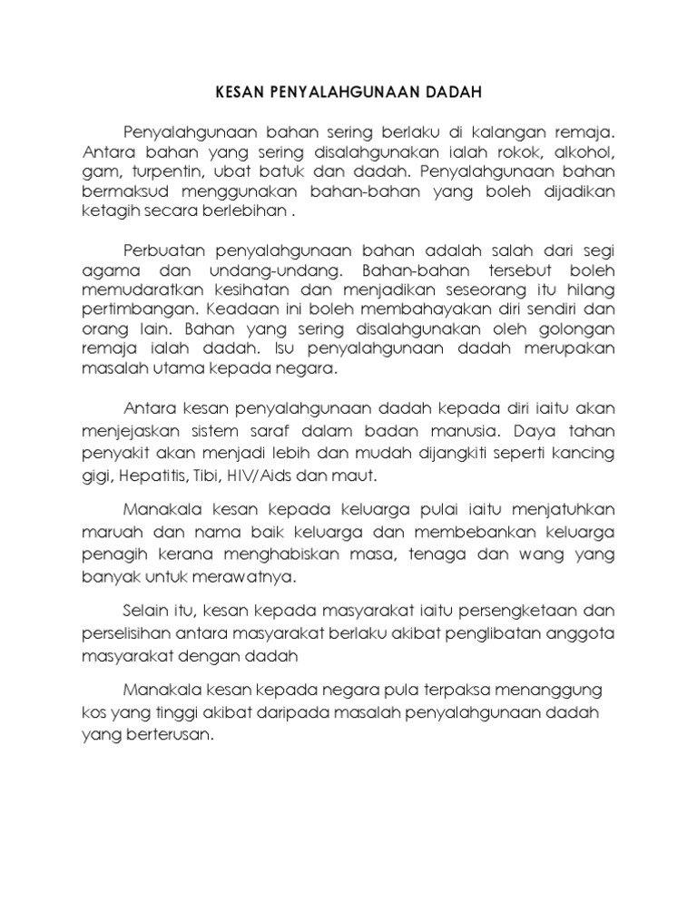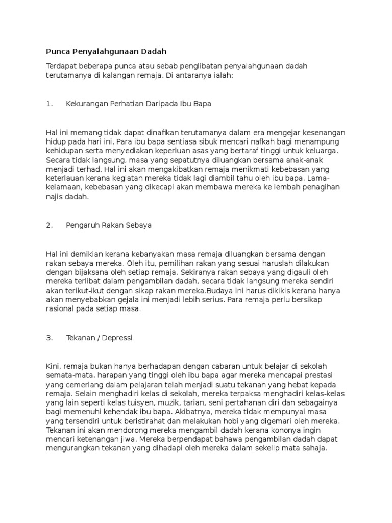 Punca Penyalahgunaan Dadah from imgv2-1-f.scribdassets.com Faktor mendorong berlakunya gejala ini kerana sikap ibu bapa yang mementingkan kerjaya. Punca remaja terjebak dengan dadah (contoh karangan). Penyalahgunaan dadah terutamanya dalam kalangan remaja amat membimbangkan dan ia berkait rapat dengan bermacam penyakit sosial seperti pelacuran, lepak, dan perjudian. Faktor yang menyebabkan adanya penyalahgunaan internet di kalangan remaja. Gejala sosial dadah semakin berleluasa dalam kalangan masyarakat malaysia kini. Mahyuddin bin arsat & azizah binti besar fakulti pendidikan. Penyalahgunaan dadah terutamanya dalam kalangan remaja amat membimbangkan dan ia berkait rapat dengan bermacam penyakit sosial seperti oleh itu, pelbagai langkah drastik perlu direncanakan dan dilaksanakan untuk memerangi ancaman dadah. Selain itu, penyalahgunaan dadah juga menjejaskan pretasi pelajaran remaja.